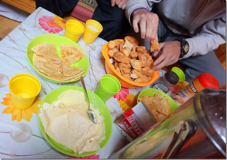 Breakfast that morning had a new contestant; a milky rich pancake that you eat with sugar. It’s the pale white dish closer to me. Other than that, we had plain pancakes, fried snacks and tea.